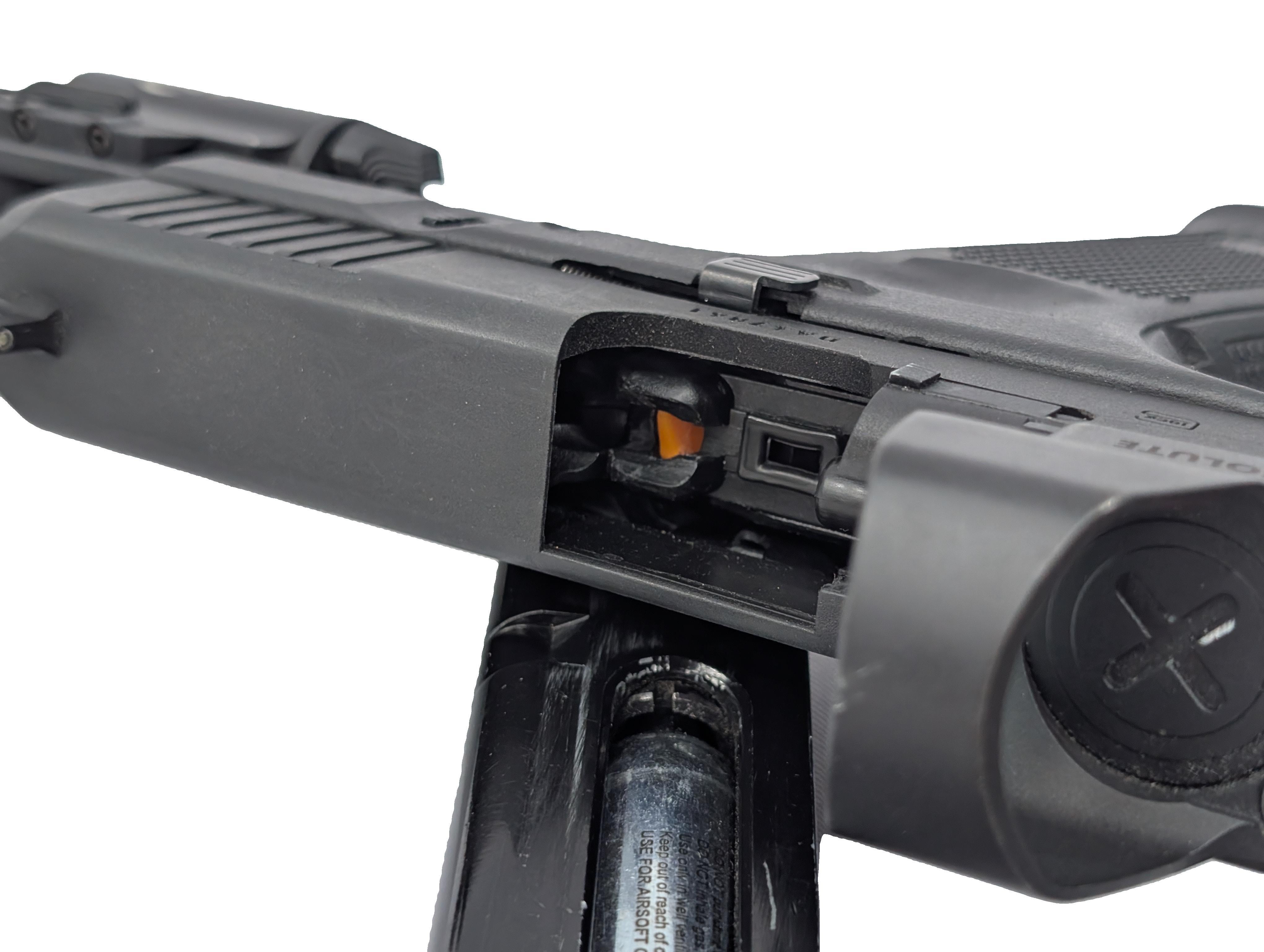 実銃のマガジンフォロアが同じようにオレンジになっているので、このような物を作りました。
